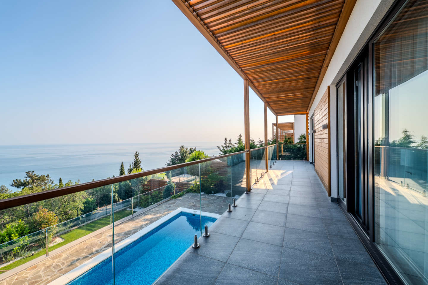Виллы выполнены в пуристическом стиле Ле Корбюзье — чистота форм, простота и уют без лишних деталей. Современная минималистичная архитектура гармонично вписана в пейзажи Ялты, не отвлекая от красоты Черного моря. В домах установлены окна Schuco с высокой теплоизоляцией и экономией энергии.